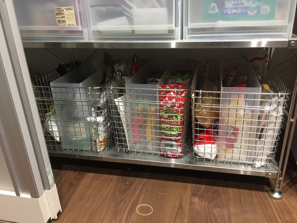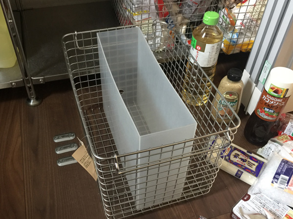 ふたつバスケットを整理したところ。ものが無理なく立てられて見やすくなりました。これによってもうケチャップのストックが2本あったり開封済みのだし昆布が2袋もあったりするキッチンとはおさらばだぜ!