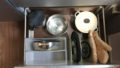 棚に戻したところ。なんだか余裕が出来たのでシンク下にあったものまで収納出来ました。どうでもいいですが右から粉類、調味料とか、製菓とか、という分類になっています。そして何故か床に落ちている輪ゴム……。