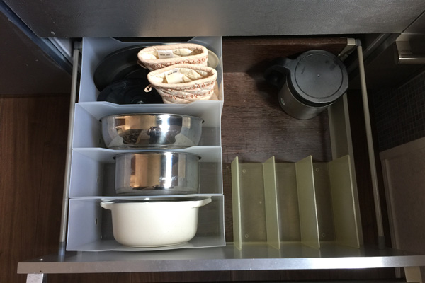 いやあ、今まで入ってなかった鉄のフライパンが収まって満足。蓋が転がらなくなって大満足!今まで2年間引き出す度に「転がるなあ~」って思ってたのは何だったのかな!?